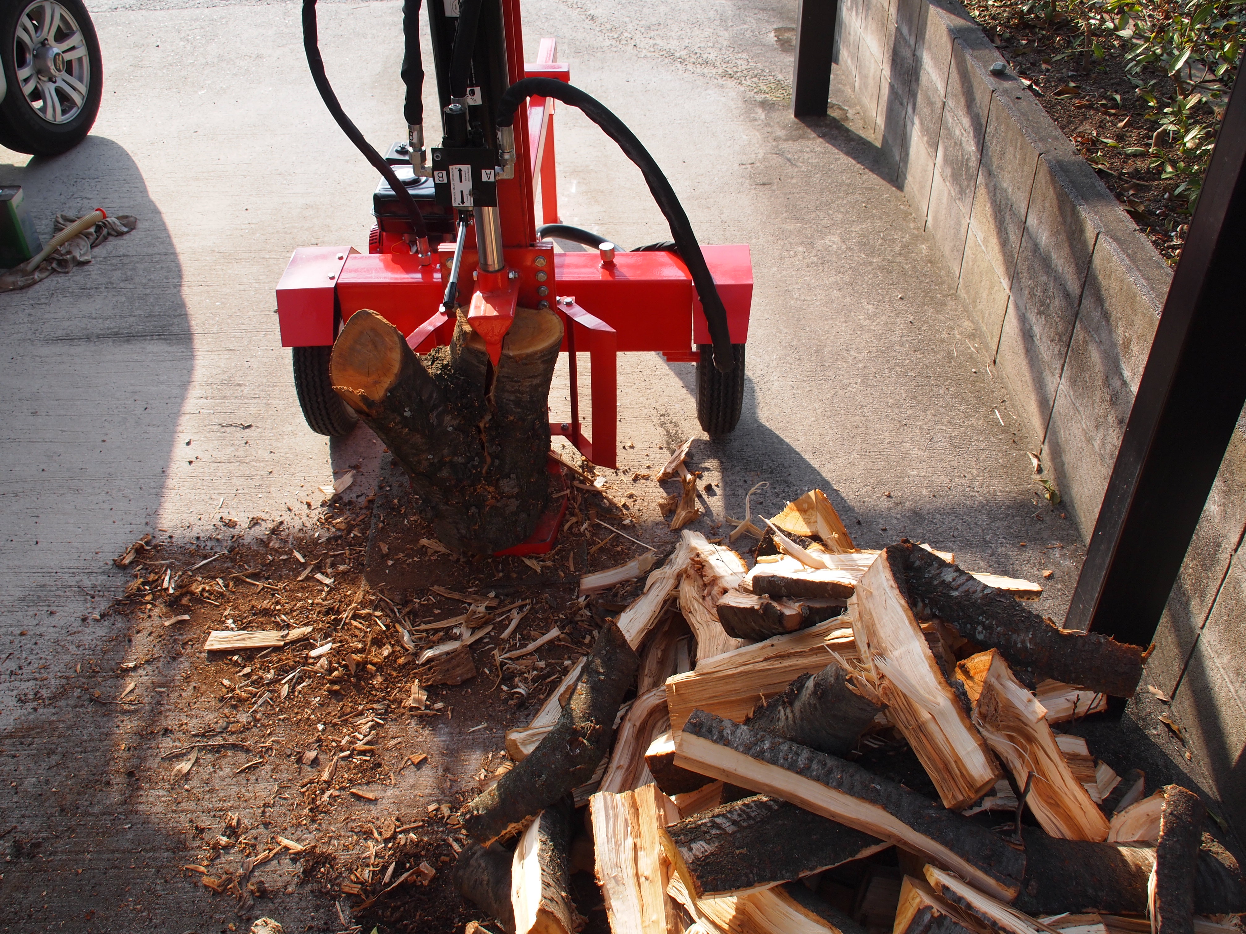 桜の木を薪割り機で割りました 股が多く 斧では割れないので 去年来た、、この機械は楽ちんです