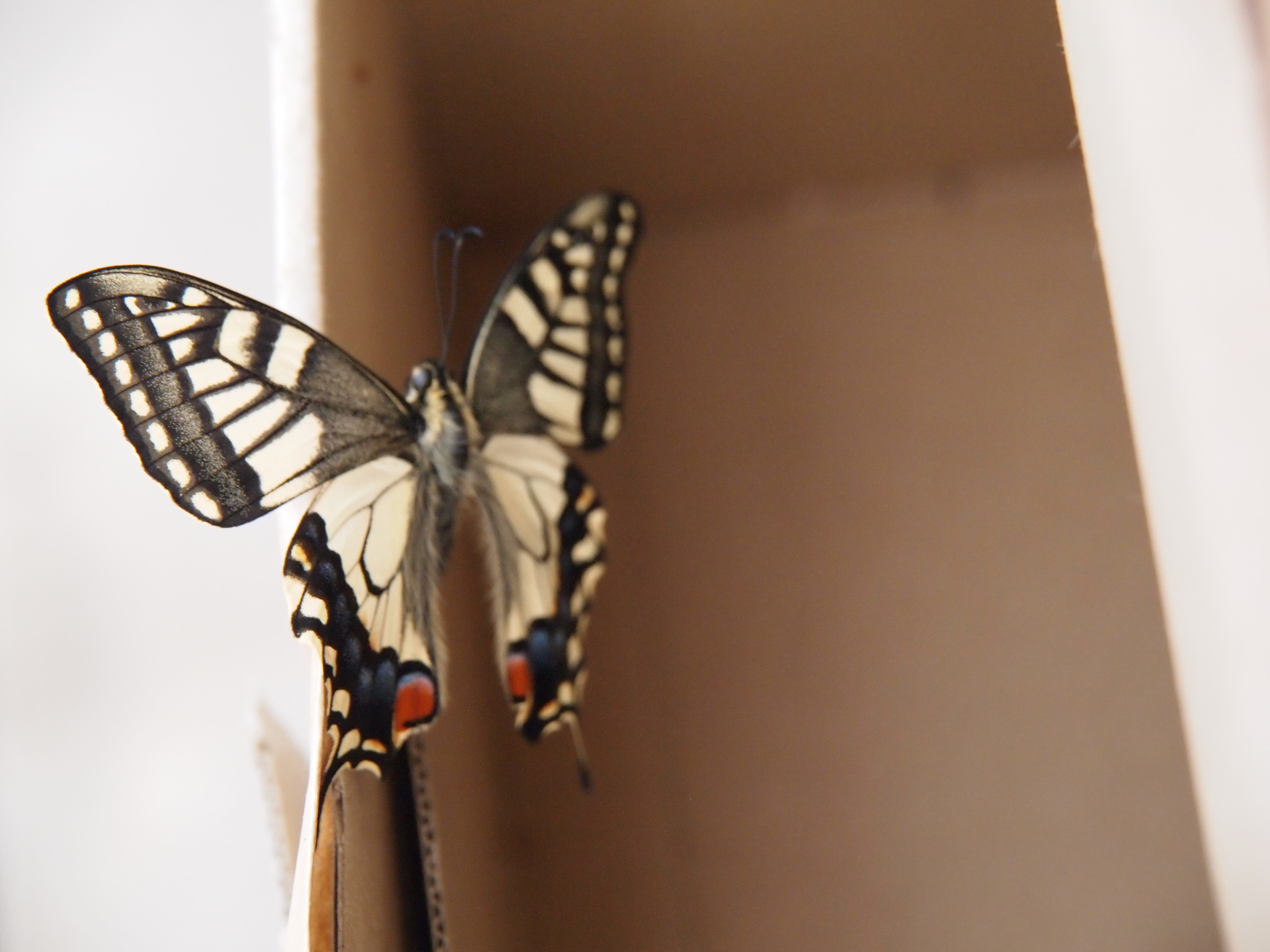 この厳しい冬を越したアゲハの蛹が 今朝羽化しました 去年は鳥に蛹を食べられるという失敗を教訓に今年は段ボールで囲ってやりました あと2匹の羽化も近いでしょう