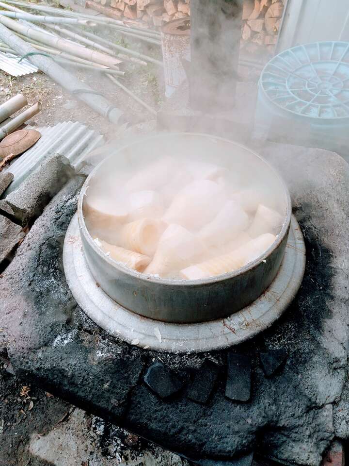 宗像市の妙見窯にタケノコを掘りに行きました この羽釜で2回茹でて持って帰りました