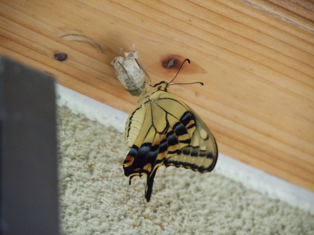 当帰(とうき)を食べて育ったキアゲハが 羽化していました 8月2日に蛹になって10日目の今朝 羽を伸ばしていました