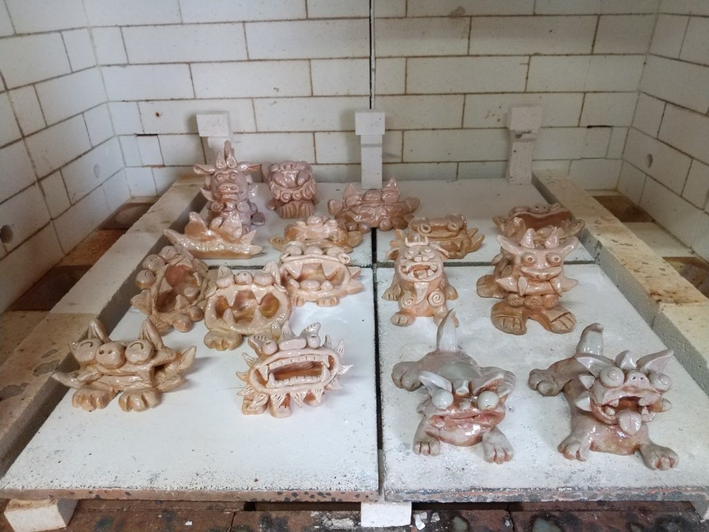 今回はクローム入り粘土に鉄釉をかけた3種類だけで あとはオリジナルシーサー作りの作品とろくろ体験の方の作品と生徒さんの作品でした