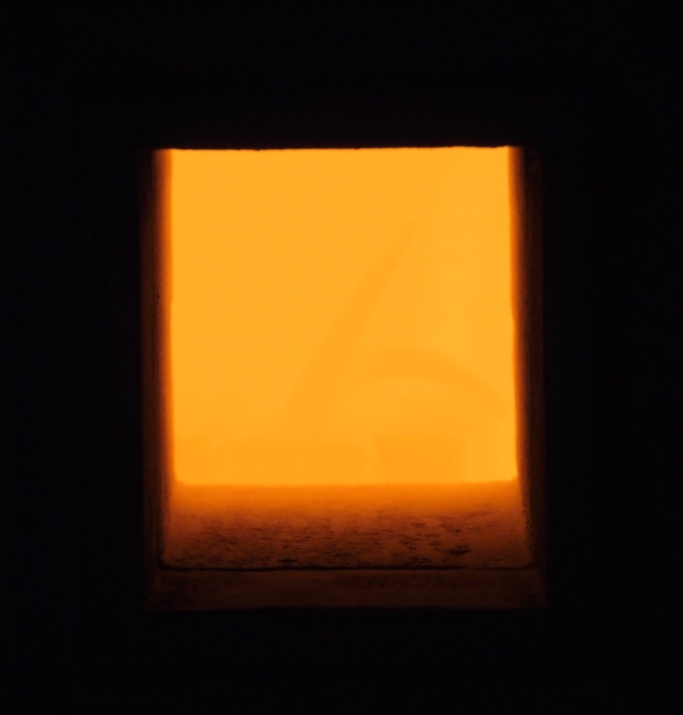昨日(21日)17時半に火を入れて 朝9時半1240度もう少しです 窯の中はオレンジ色 微かにゼーゲルコーン(蓄熱式温度計)が見えます